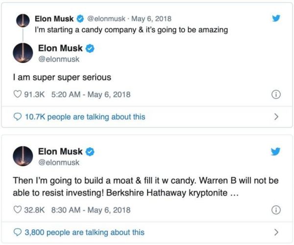 马斯克随后在推特上回应称自己会开一家糖果公司,挖出条护城河,用糖果填满它,称“巴菲特一定不会拒绝投资它”。
