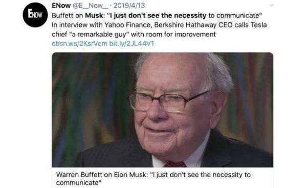 2019年在接受雅虎财经采访时,问及如何看待马斯克“推特红人”的作风,巴菲特直言“没必要这么频繁地发推”,并评价特斯拉CEO“卓越,但也还有提升空间”,言语中对马斯克高调的个人作风暗含微词。