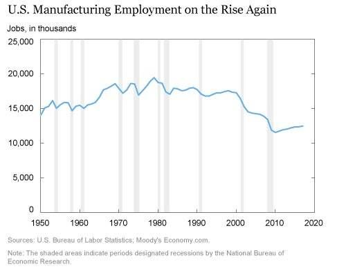 而在就业方面,美国国内的现状是大量就业人口转向金融相关行业。即便大量工厂希望回归本土,也面临美国制造业缺少新鲜血液的事实。事实上,美国国内制造业的岗位数量在经历了从2000年开始的10年下降过程后,现在已经维持了10年的增长势头。2019年美国制造业就业岗位比2010年增加了近100万个。