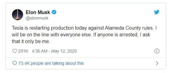 马斯克在推特上表示特斯拉将强行复工,“要抓就抓我吧”