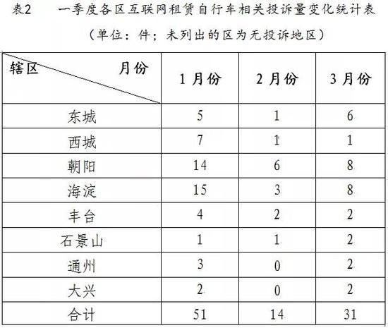 2020年1-3月份,全市有关互联网租赁自行车车辆管理维护、乱停乱放等投诉总量共计96件(各区投诉情况如表2所示),一季度总体投诉量相较去年同期有明显下降。