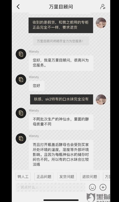 用户提供的与万里目顾问的沟通截图显示,万里目顾问称,“跨境商品入库都是要过海关验收的,非真商品无法入库。我们郑重承诺所售商品均为正品。”其中对希思黎全能乳液产品的用户还回复称,“希思黎产品均带有植物芳香,不同的生产批次可能有所差异,质地会受到温度、生产批次等因素的影响可能有所差别。”而“商万里目奢侈品”账户的回复内容则基本为隐藏状态。