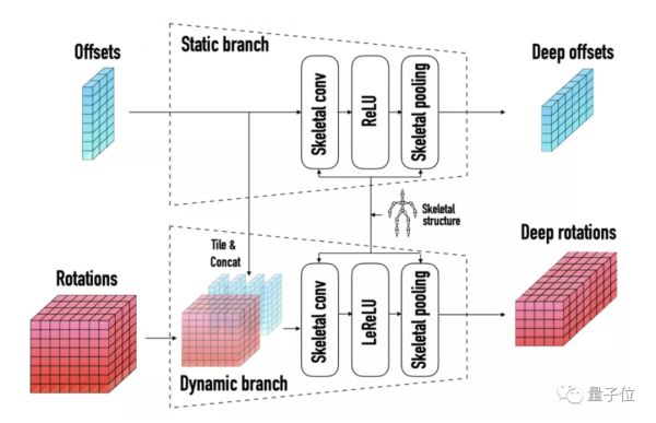 研究人员使用静态骨骼位置+动态关节旋转来表示骨骼上的动作,并把不同骨骼之间的动作迁移视作无配对的域转移任务,将动态静态部分分别处理,构建了用于同胚骨骼之间无需配对示例的动作迁移深度学习框架。