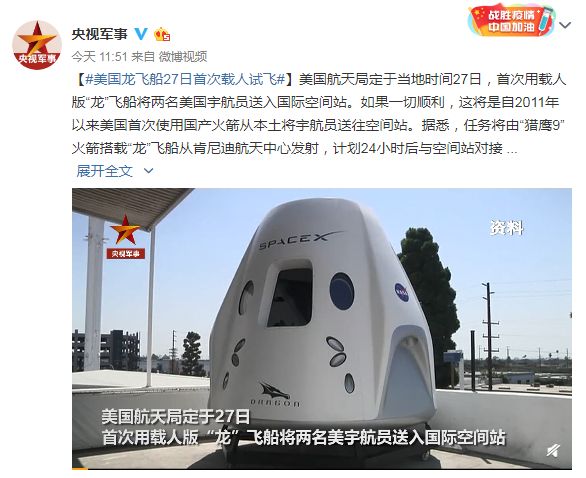 美国“龙”飞船27日首次载人试飞,计划24小时后将2名宇航员送入空间站