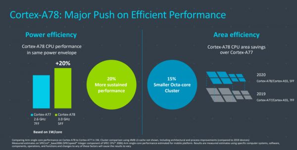 如果实在同样性能的条件下做对比,同频率下 A78 的性能升幅为 7%,而去年的 A77,同频率下比前代性能提升了 20%;相同条件下,功耗下降 4%。