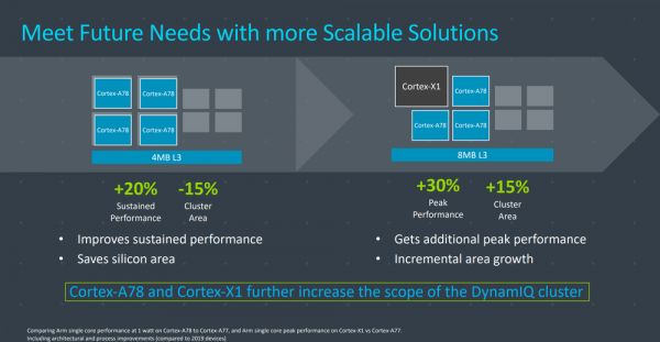 ARM 官方表示,采用 DynamiQ 的 A78 产品(4✖️A78 +4✖️A55)和基于 A77 的 DynamiQ 方案(4✖️ A77 +4✖️ A55)相对比,A78 能减少 15% 面积,同时提升 20% 的性能。但是,在对比方面,ARM 有点“作弊”地用 5nm 的 A78 与 7nm 的 A77 做对比,这才获得了 20% 的性能提升,这其中不少功劳是 5nm 的。