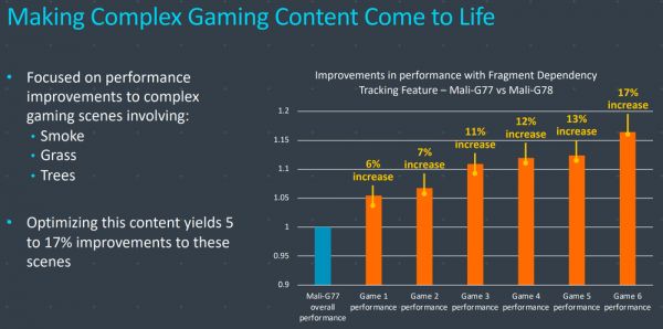 相比较 CPU,Mali GPU 的更新没有太多惊喜,仍基于 Valhall 架构,ARM 表示 Mali-G78与 G77 相比,特定工作负载的性能提高了25%,能耗比提升10%,性能密度提升15%,提升幅度也不如上一代大——Mali-G77 相比较 G76,性能提升30% 功耗下降 50%。
