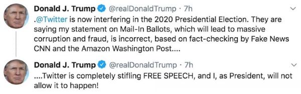 数小时后,特朗普怒斥推特公司干预2020年美国总统大选,连发两条推文。“推特完全是在扼杀言论自由。作为总统,我绝对不会允许这种情况发生”!