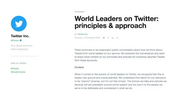 推特公司发布“世界领导人”的政策。/ 推特网站截图
