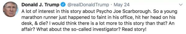 据《国会山报》报道,当地时间5月24日,特朗普利用推特传播关于微软全国广播公司(MSNBC)主持人斯卡伯勒的“阴谋论”,但推特公司随后表示,不会删除此类推文。
