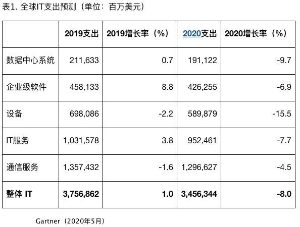 Gartner预计,2020年全球IT支出总额预计将达到3.4万亿美元,比2019年下降8%。