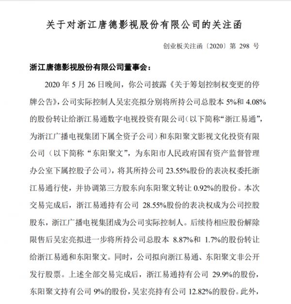 @虎嗅【二十天内两次筹划控制权变更,唐德影视收到关注函】5月27日晚间,唐德影视收到交易所关注函,要求说明吴宏亮两次筹划控制权变更及短期内调整控制权变更方案的原因及合理性,相关事项决策过程是否合理审慎,本次控制权变更方案是否存在重大不确定性。 结合本次各交易的具体安排,说明公司控股股东、实际控制人拟发生变更的具体时点、判断依据及合规性,非公开发行事项若未获得通过对公司控制权的影响及后续安排。