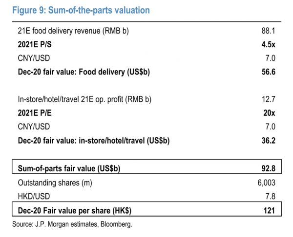J.P.Morgan对美团外卖业务的估值为4.5倍2021年预期市销率(PS),这比全球其他外卖平台高出10%,因为中国市场增长更快;到店、酒旅业务,J.P.Morgan给出了20倍的2021E P/E,这比携程的PE高出15%,因为美团的盈利能力更强并且不受国际旅行减少的影响。