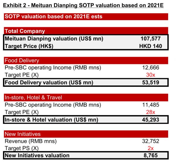 对于新业务,China Renaissance给予了2021E的2倍市销率(PS),得出90亿美元估值。
