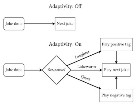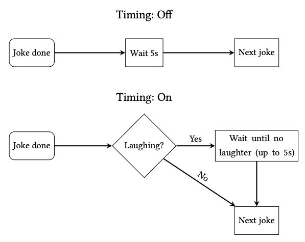 而在自适应模式(appropriate-timing mode)下,机器人会使用的时机策略在笑声想起时暂停,并在笑声平息后继续进行,就像一个优秀的人类喜剧演员一样。
