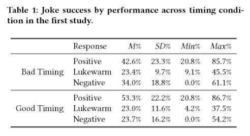 综合以上研究,Fitter 总结道:「在坏时机模式(bad-timing mode)下,机器人总是在每个笑话之后等了整整 5 秒钟,不管观众的反应如何。
