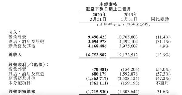 财报显示,美团点评Q1季度营收167.53亿元,同比减少12.6%;经营亏损17.16亿元,同比增加31.6%;调整后净亏损2.163亿元。