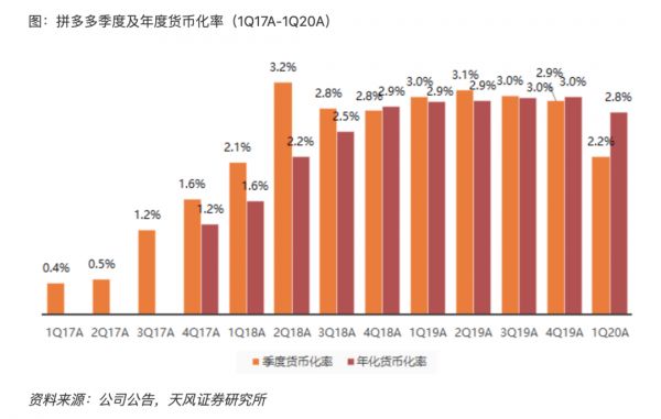 拼多多的年化GMV继去年底突破1万亿之后,这次又同比增长了108%,疫情期间依然保持了三位数的增长。不过,拼多多的季度货币化率下降到了过去两年以来的最低点,只有2.2%。