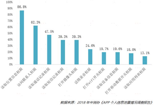 APP最热衷收集的就是获取用户位置和通讯录信息。根据《APP个人信息泄露情况调查报告》,读取位置信息权限和访问联系人权限是安装和使用手机APP时遇到情况最多的,分别占86.8%和62.3%。受访者被要求读取通话记录权限(47.5%)、读取短信记录权限(39.3%)、打开摄像头权限(39.3%)、话筒录音权限(24.6%)的比例也相对较高。