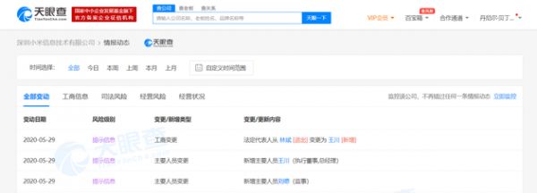 网易科技讯 5月29日消息,天眼查数据显示,近日,深圳小米信息技术有限公司发生工商变更,小米联合创始人、副董事长、手机部总裁林斌不再担任公司法定代表人,由小米集团首席战略官王川接任。此外,该公司还新增王川为执行董事、总经理,新增小米联合创始人、高级副总裁刘德为监事。