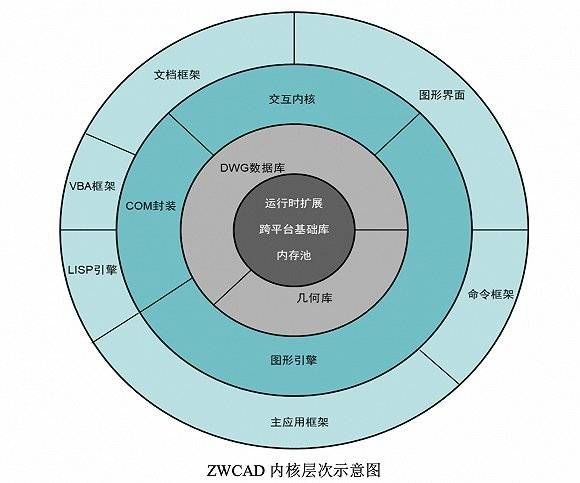如图所示,中望CAD的DWG数据库、几何库包含了ODA组织的技术,外层的图形引擎、图形界面等则包含了ITC组织的技术。