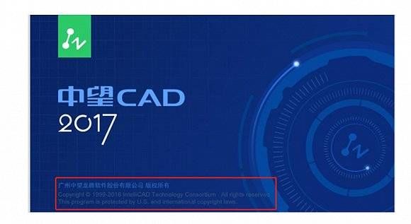 2017年至2019年,中望CAD在软件的启动界面上,启动界面的英文版权说明中,明确了中望CAD的知识产权属ITC所有。