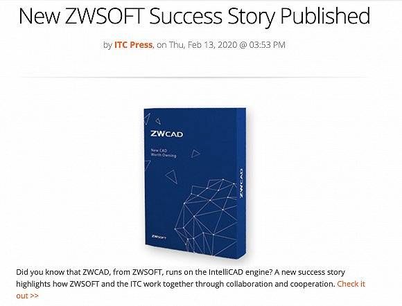 就在今年2月,ITC专门发布新闻稿,称中望CAD(ZWCAD)是其组织的新成功案例,而ITC则是中望CAD(ZWCAD)软件的核心技术伙伴。
