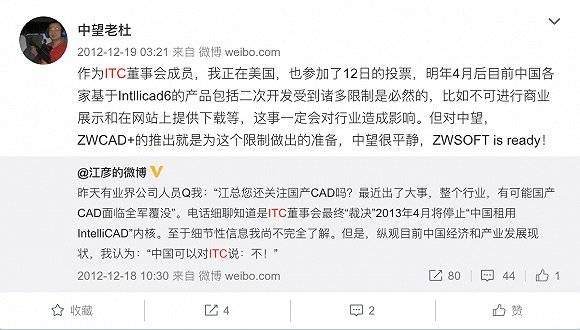 2012年,中望董事长杜玉林在其个人微博上的发言。