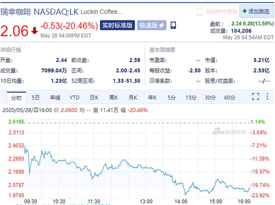 周四收盘,瑞幸咖啡股价大跌20.46%,报收2.06美元。