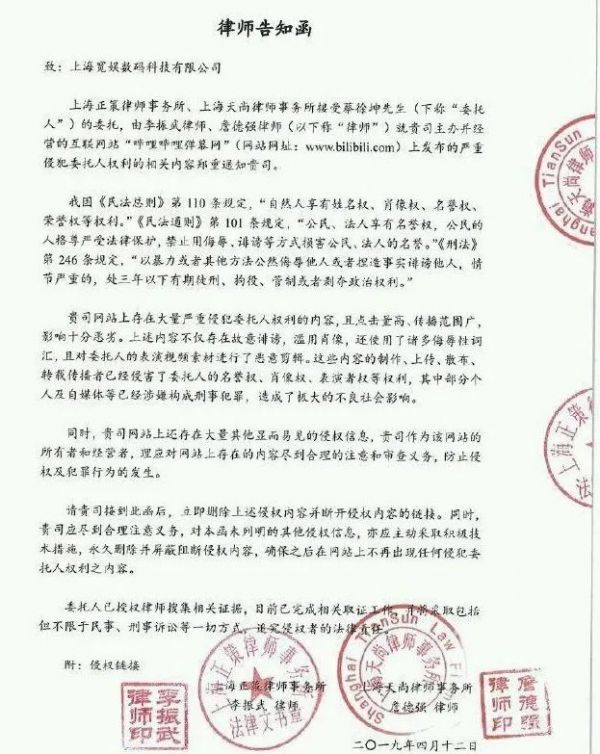 蔡徐坤委托律师发给 bilibili 的告知函