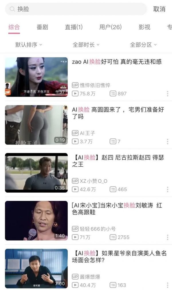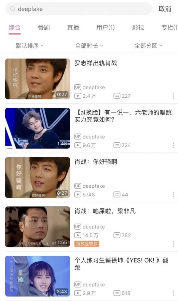我们在今天用 AI 换脸这一关键词,分别在抖音、快手和 bilibili 上用 AI 换脸、换脸、Deepfake 三个关键词,进行了搜索。