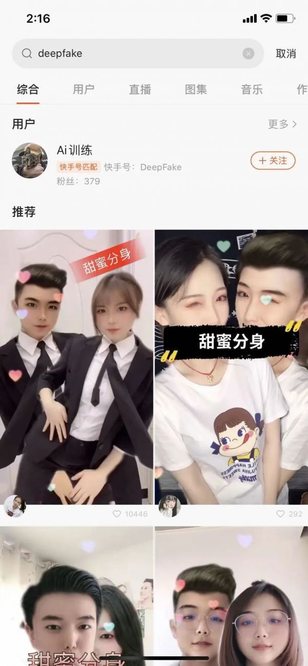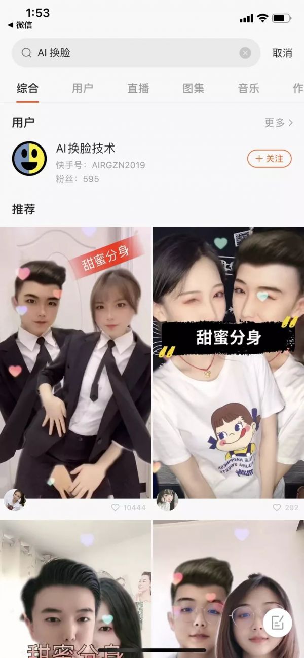 但推荐相关账号,账号中包含影视、公众人物的 AI 换脸视频。