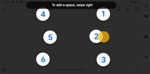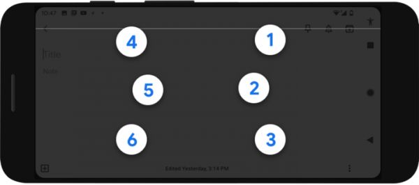 在 Google 的盲文输入法中,点击键位 1,则输入字母 A;同时点击键位 1 和 2 ,输入字母 B;同时点击 1 和 4 ,输入字母 C,同时点击 1、4、5,则输入字母 D,以此类推,暂时只支持英文。