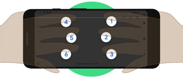 在输入盲文时,用户需要同时用六个手指点击屏幕,因此在使用时需要采取一种比较特别的横握姿势,要将屏幕朝外,用大拇指和尾指顶住架着手机,其余手指用于点击屏幕。盲文键盘中的 6 个点,其实是 6 个区域,这也是为了更方便盲人点击。