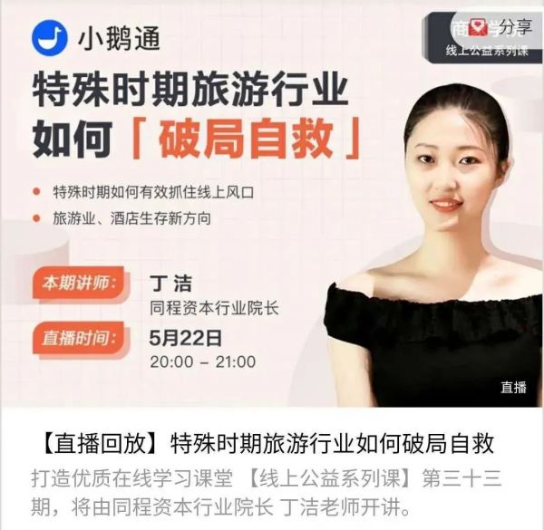 5月22日晚,同程资本行业院长、旅游学院创始人丁洁做客小鹅通,详细为行业支招,详细讲解特殊时期如何有效抓住线上风口,分析旅游业、酒店业的生存新方向。