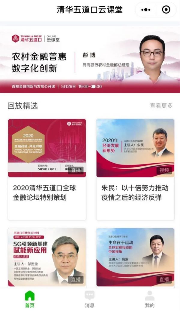 据了解,“清华五道口在线学习计划”由在线大讲堂、在线学习包、校友专属资源三部分组成,皆邀清华五道口授课名师和学员代表,进行网络直播讲座,讲座内容涵盖以下六个模块:宏观展望、行业应对、管理实践、金融趋势、科学新知、健康管理。目前已经成功运营了十余场公开直播,线上观看人次超千万。