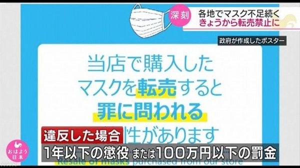 但好日子没过多久,日本内阁会议就决定,严查口罩倒卖行为,违者面临1年以下徒刑或者100万日元以下的罚款。