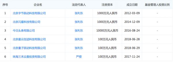 字节跳动旗下有多家管理基金,其五家法定代表人是二号人物张利东,一家法定代表人是严授。
