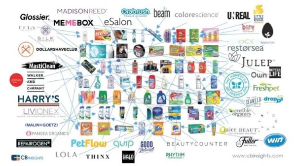 宝洁旗下多个品类遭受DTC品牌的挑战,来源:CB Insights,IAB,聚美丽