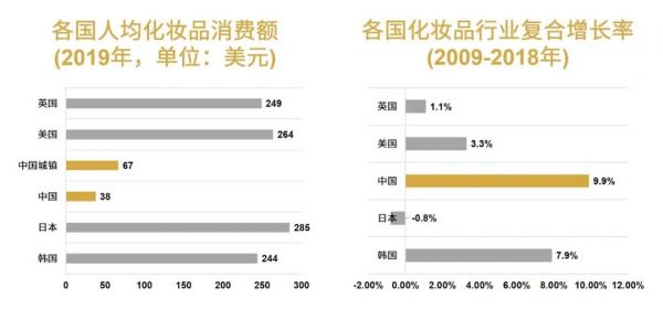 例如我国2.27亿“小镇青年”,他们的需求交织着“质优”和“价廉”,使得众多具备高性价比优势的DTC品牌,出现的恰逢其时。此外,许多细分品类的市场规模增速远超同期全球市场增速,同时人均消费额却处于较低水平。以化妆品为例,中国已是仅次于美国的全球第二大化妆品市场,然而人均化妆品消费额远远落后日韩英美等国家。