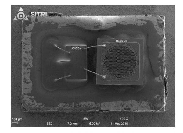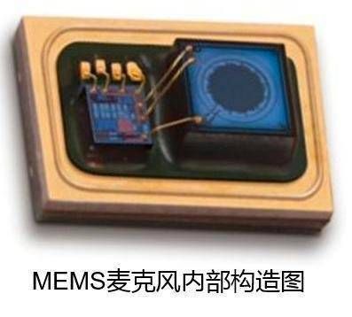 MEMS 麦克风内部构造放大图,右 MEMS 芯片,左 ASIC 芯片