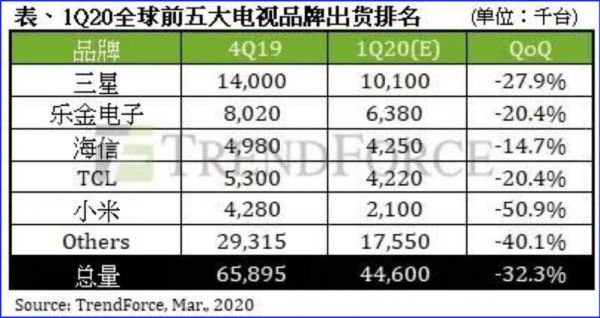 从销量来看,小米电视已经受到了不小的影响。近日市场研究机构TrendForce发布一季度全球电视出货量数据(预估),其中显示,在全球前五大电视品牌出货排名中,小米出货量环比降幅最大,超过50%,降幅不仅大于三星、海信、TCL等,也远超过行业平均水平。