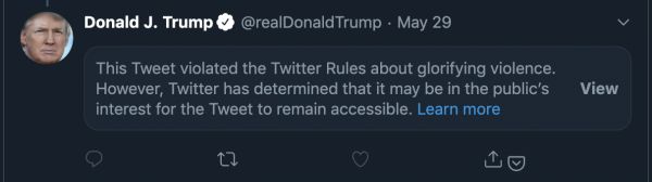 推特将特朗普的言论贴上了一个标签,警告用户注意特朗普的暴力言论,用户需点击确认之后才能查看特朗普的推文。同时,推特还禁止了用户“喜欢”或“转发”这条推文。