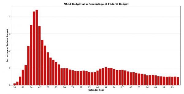 我们刚刚提到,NASA每年从美国政府得到的经费支持虽然在连年上升,但是占财政预算的比例却不断下降。