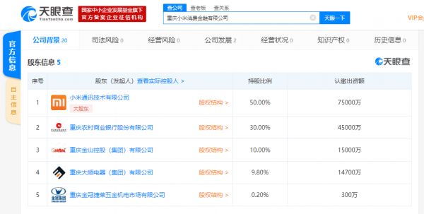 天眼查数据显示,重庆小米消费金融有限公司注册成立于2020年5月29日,注册资本15亿,法定代表人为小米联合创始人、高级副总裁、小米金融董事长洪锋。天眼查股东信息显示,小米通讯技术有限公司持股50%,为该公司最大股东; 重庆农村商业银行股份有限公司持股30%,为公司第二大股东。
