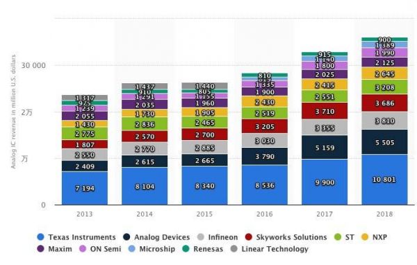 德州仪器在2017年的模拟销售额为99亿美元,市场份额为18%。2017年模拟收入占其IC总销售额130亿美元的76%,占其半导体总收入139亿美元的71%,根据IC Insights的估算。德州仪器是最早在300mm晶圆上制造模拟半导体的公司之一。德州仪器声称,与使用200mm晶圆相比,在300mm晶圆上制造模拟IC使其每个未封装的芯片的成本优势降低了40%。2017年,德州仪器模拟收入的大约一半来自使用300mm晶圆制造的设备。