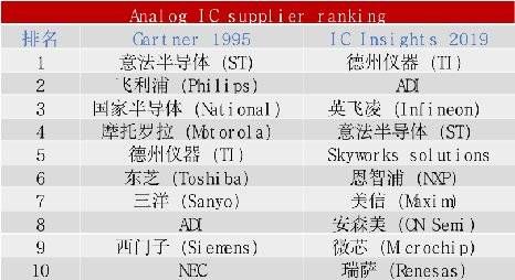 在1995年模拟IC供应商排名第二的飞利浦(Philips),于2006年剥离其半导体业务成立了NXP Semiconductors。如今NXP在2019年的榜单上排名第六。
