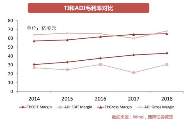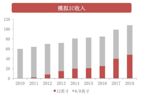 据西南证券统计的数据,假设每一芯片的封测成本不变,生产自300mm晶圆的芯片比生产自200mm晶圆的芯片成本如果以封测后测算则要低20%,而以未封测芯片测算则直接低40%,最终带动芯片的毛利率从60%上升到68%。2017年和2018年,公司产自300mm晶圆的模拟芯片带来的收入分别为40亿美元和48亿美元,分别占当年模拟业务总收入的40%和45%。