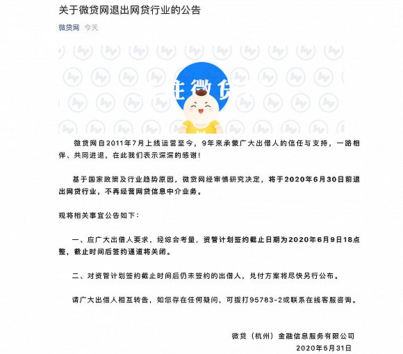 5月31日晚间,微贷网宣布不再经营网贷信息中介业务。公告称,基于国家政策及行业趋势原因,微贷网经审慎研究决定,将于2020年6月30日前退出网贷行业,不再经营网贷信息中介业务。