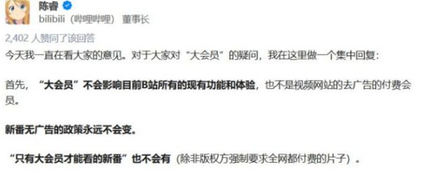 以至于在B站首次出现付费会员时,舆论是支持>反对的,很多用户甚至鼓励B站付费,当然这也是全民版权化之后,B站付费会员制的阻力很小,而且B站董事长陈睿也承诺了一系列原则: